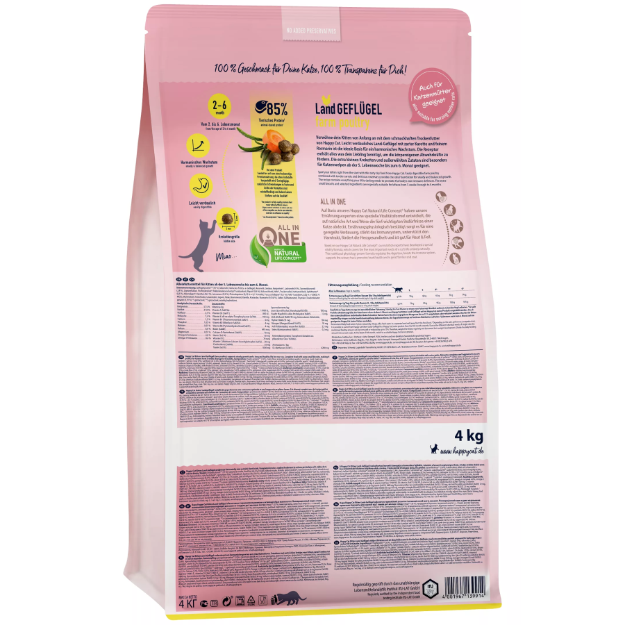 Περιποιηθείτε το γατάκι σας από την αρχή με αυτή τη νόστιμη ξηρή τροφή από την Happy Cat. Εύκολα εύπεπτα πουλερικά φάρμας με τρυφερά καρότα και λεπτό δεντρολίβανο είναι η ιδανική βάση για αρμονική ανάπτυξη. Η σύνθεση περιέχει όλα όσα χρειάζεται η γατούλα σας για να προωθήσει τα φυσικά αμυντικά της συστήματα.